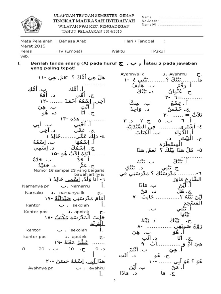 Soal bahasa arab semester 2 kelas 1. We did not find results for: Check spelling or type a new query. Maybe you would like to learn more about one of these?